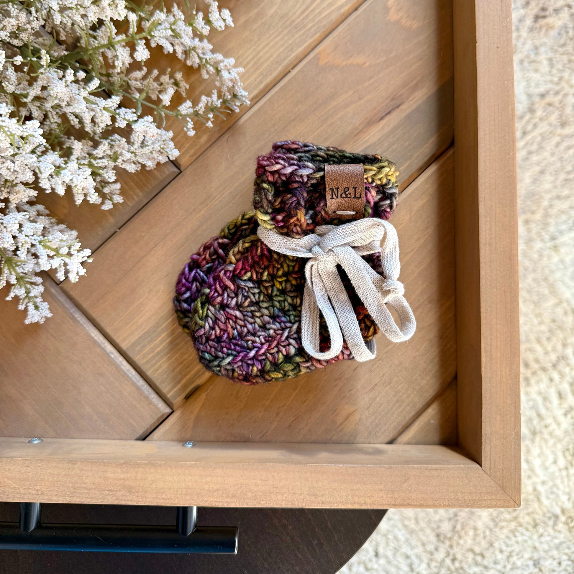 These wool free booties are made from the finest Hand Dyed Merino Yarn, sourced from Peru. Hand washing will extend the life of any knit item, but this yarn is safe to be machine washed, Lay flat to dry. Remove ties prior to laundering.