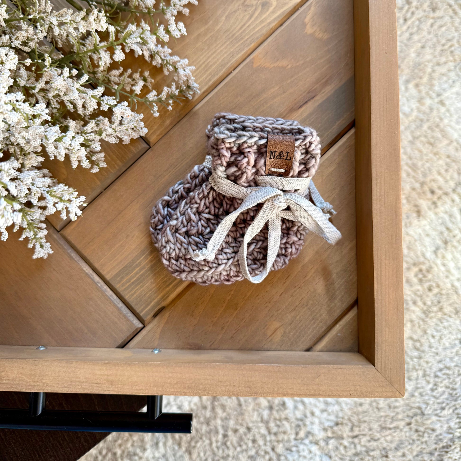 These wool free booties are made from the finest Hand Dyed Merino Yarn, sourced from Peru. Hand washing will extend the life of any knit item, but this yarn is safe to be machine washed, Lay flat to dry. Remove ties prior to laundering.