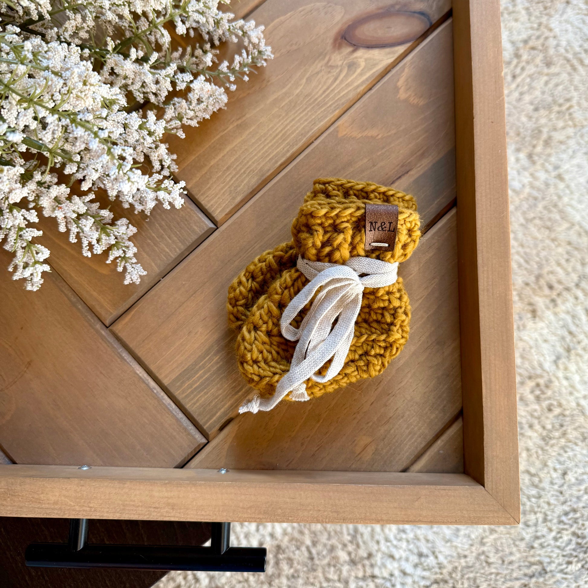 These booties are made from the coziest 100% Wool. Please note that this material is hand wash only. However, this natural material requires far less washing than acrylic yarn. These will regulate babies temperature and wick away moisture.