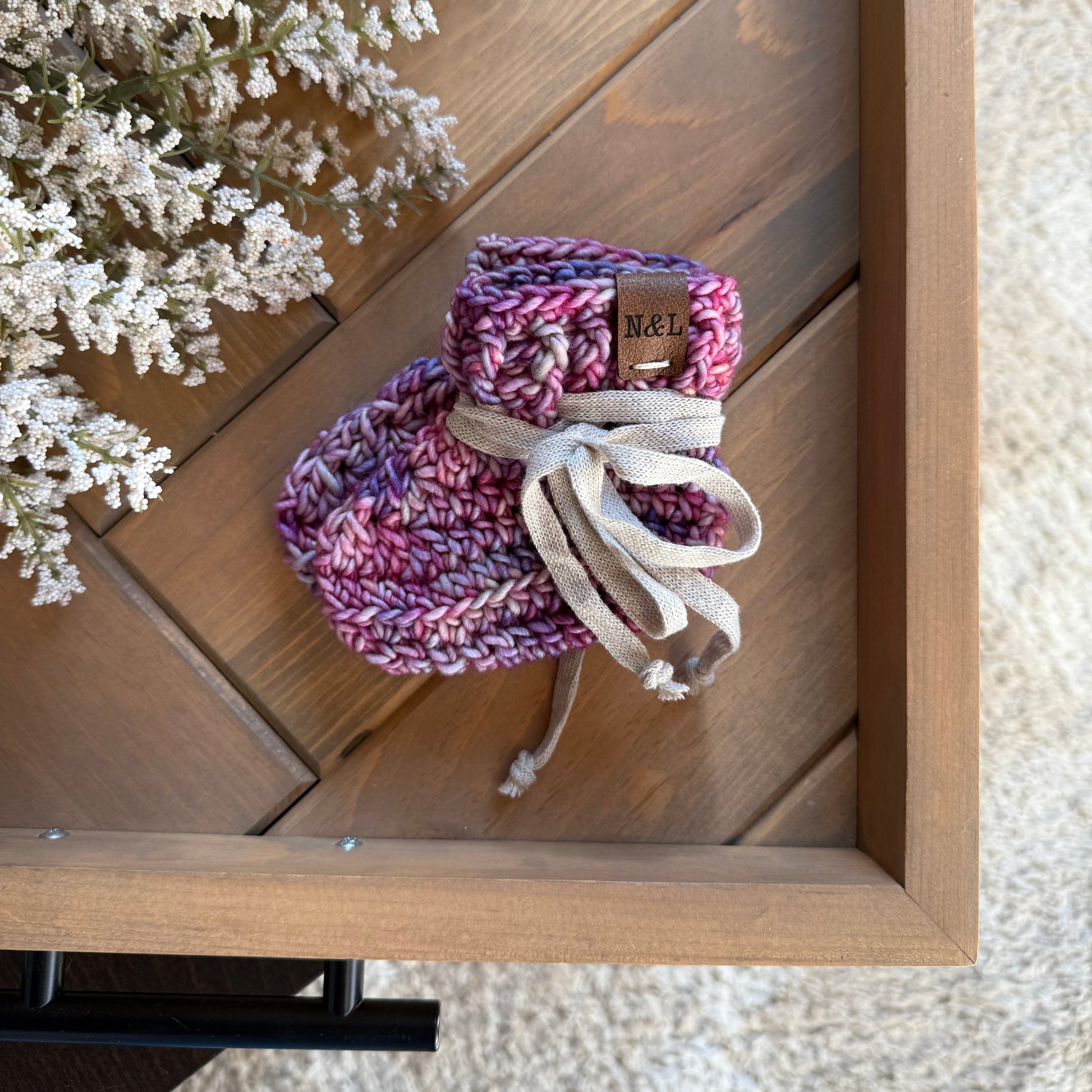 These wool free booties are made from the finest Hand Dyed Merino Yarn, sourced from Peru. Hand washing will extend the life of any knit item, but this yarn is safe to be machine washed, Lay flat to dry. Remove ties prior to laundering.